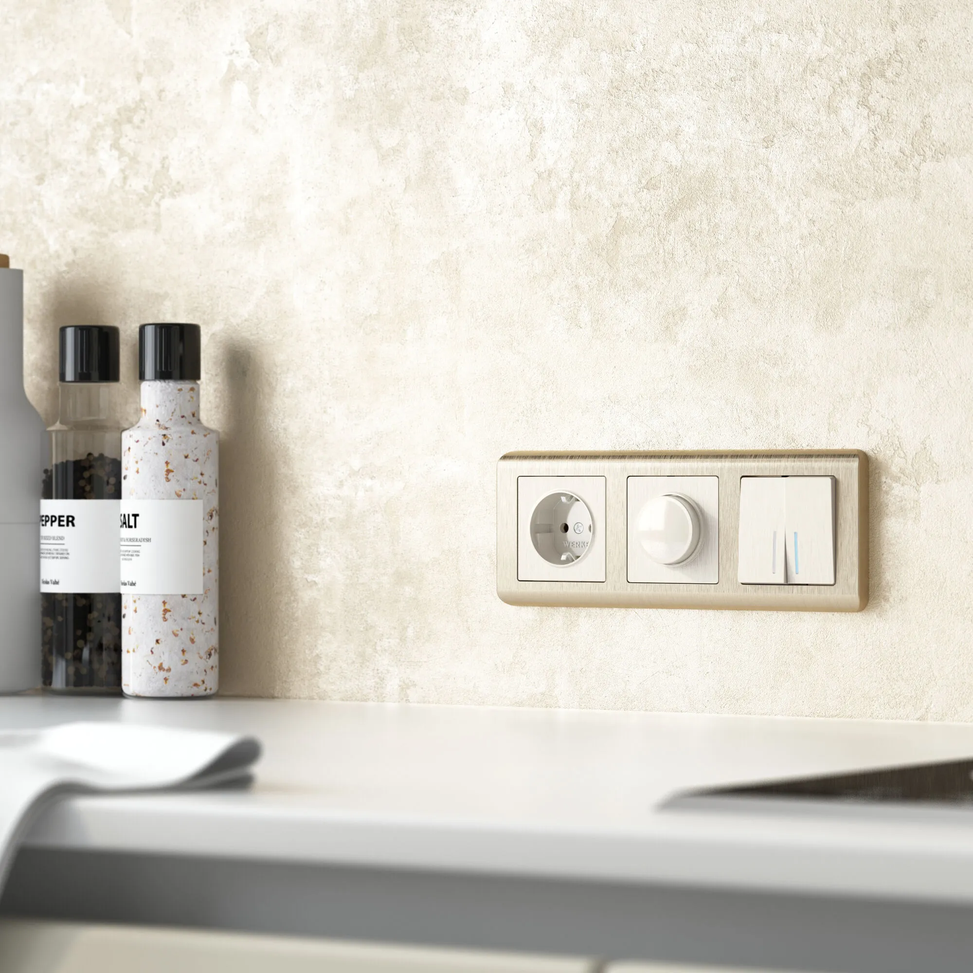 Лицевая панель выполнена в перламутровом цвете с рельефной фактурой и тактильной мягкостью. Такая поверхность не бликует, не притягивает пыль и идеально вписывается в любые стили — от скандинавского минимализма до лофта и классики. Гармонично сочетается с любыми отделочными материалами, а универсальная совместимость со всеми рамками Werkel позволяет создавать индивидуальные композиции под ваш вкус.
