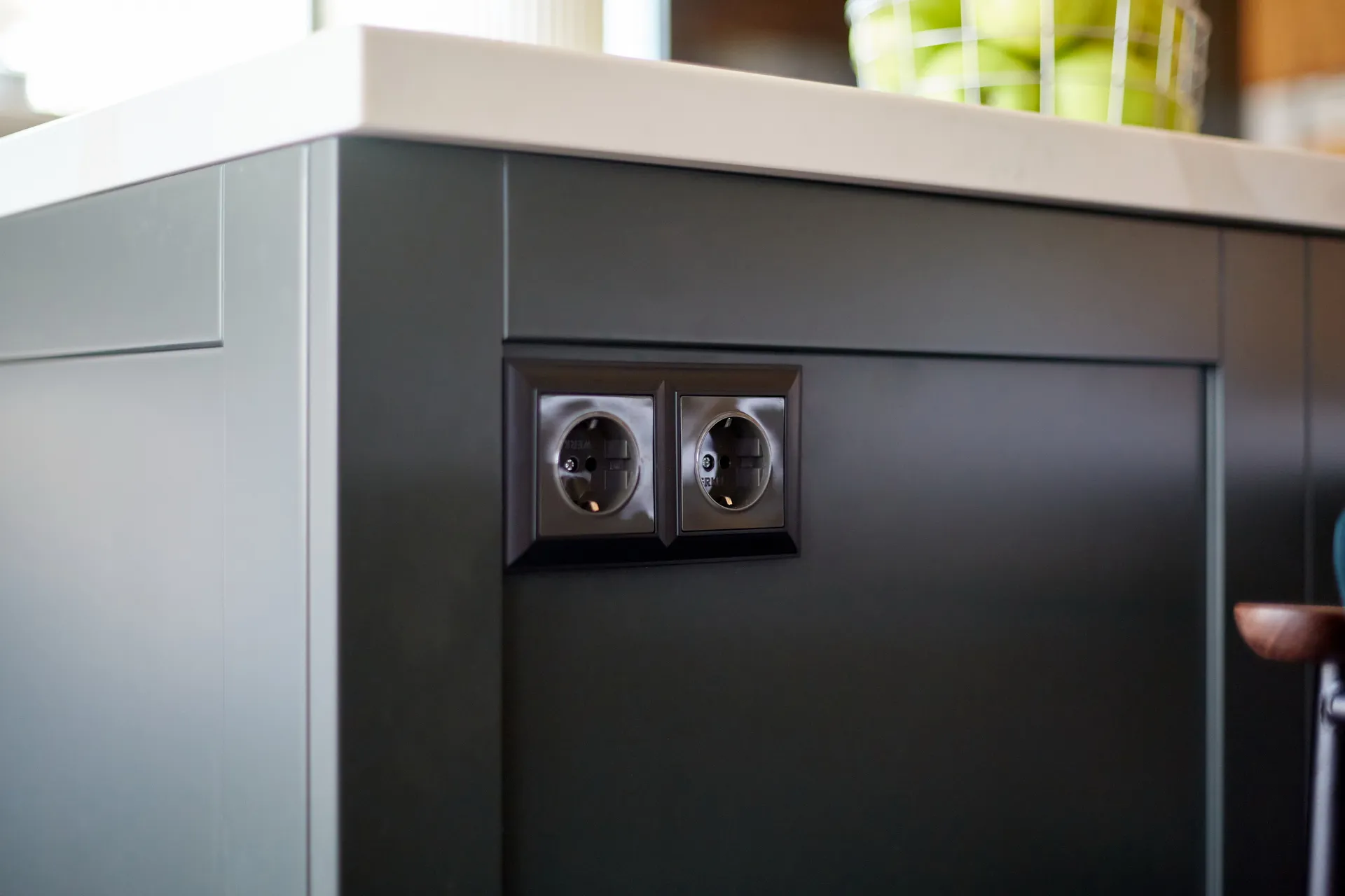 Стильным украшением обновленной кухни-гостиной стали электроустановочные изделия Werkel™. Рамки из коллекций Favorit и Fiore, дополненные надежными розетками и выключателями, органично вписались в интерьер. Их строгие формы и цветовая гамма дополнили предметы мебели, создавая единую композицию.